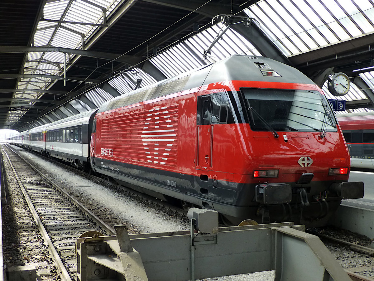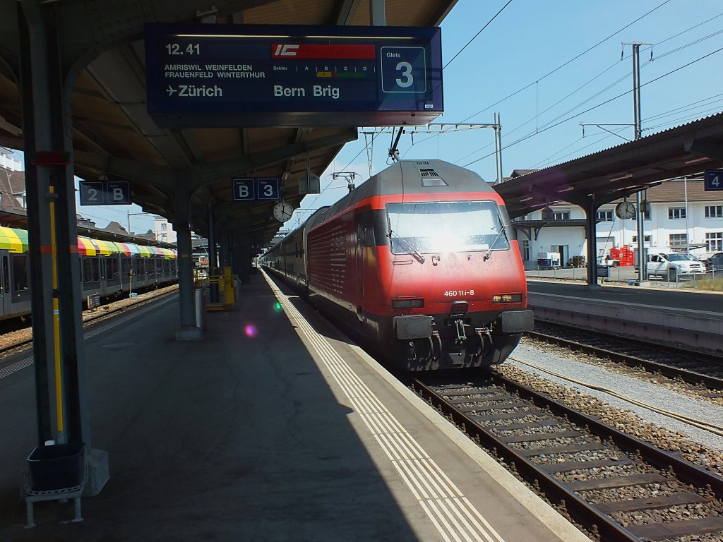 Eine Doppeltraktion Re 460 (die Loks mit den Nummern 022 und 106) fahren hier am 04.08.14 in Basel ein.