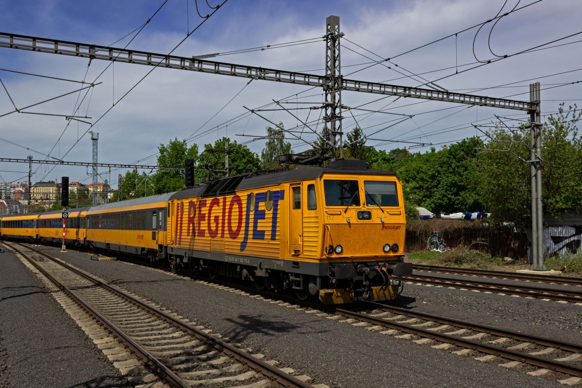 Um kurz vor 4 Uhr am frühen Morgen ist 162 117 mit dem RegioJet 1008 in Košice im Osten der Slowakei gestartet. Etwas mehr als 8 Stunden später durchfährt die Lok mit ihrer Zuggarnitur auf dem Weg zum Abstellbahnhof durch Vršovice.