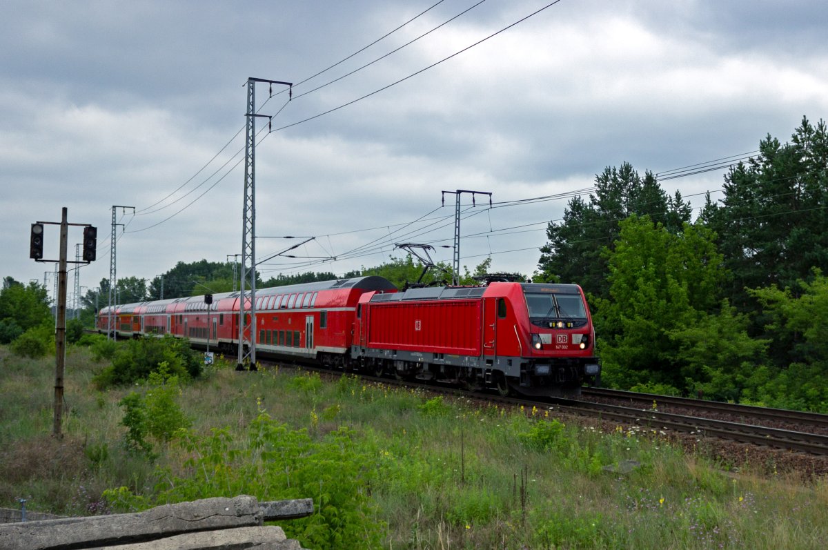 147 010 beschleunigt mit einem RE3 nach Berlin Hbf nach einem Zwischenhalt im Bahnhof Ludwigsfelde.