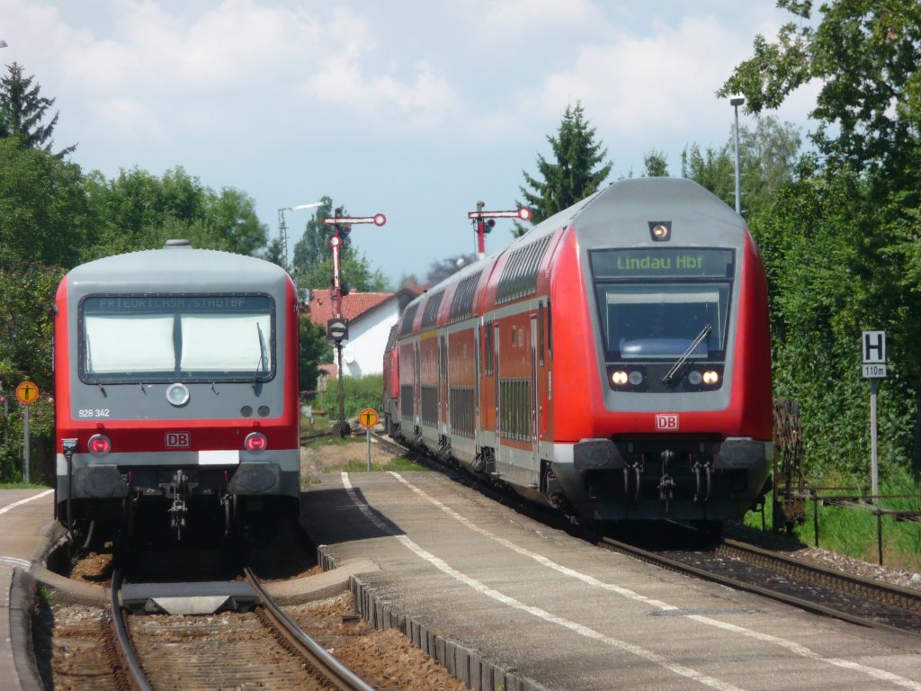 218 438 durchfährt am 29.07.2011 den Bahnhof Nonnenhorn am Bodensee. Ziel des Zuges ist Lindau Hauptbahnhof.