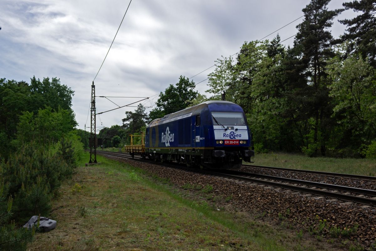 Mit einem einzelnen Güterwagen ist die von Beacon Rail an die Firma SKL vermietete 223 014 südlich von Berlin unterwegs. Die Lok trägt noch die großflächige Beklebung eines Vormieters, der kroatischen Firma Rail&Sea.