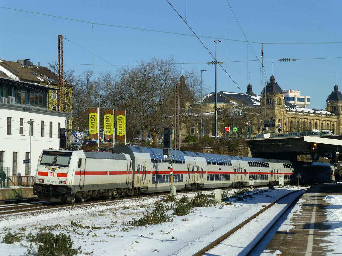 IC2-Garnitur, geschoben von 146 559, auf dem Weg nach Dresden. W-Steinbeck, 12. Februar 2021.