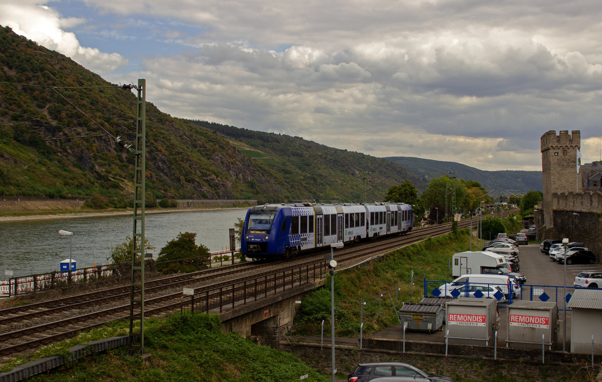 Vlexx-Lint 622 430 durchfährt das Mittelrheintal, während ein Schubverband die Loreley vor einigen Minuten hinter sich gelassen hat und nun flussaufwärts unterwegs ist.